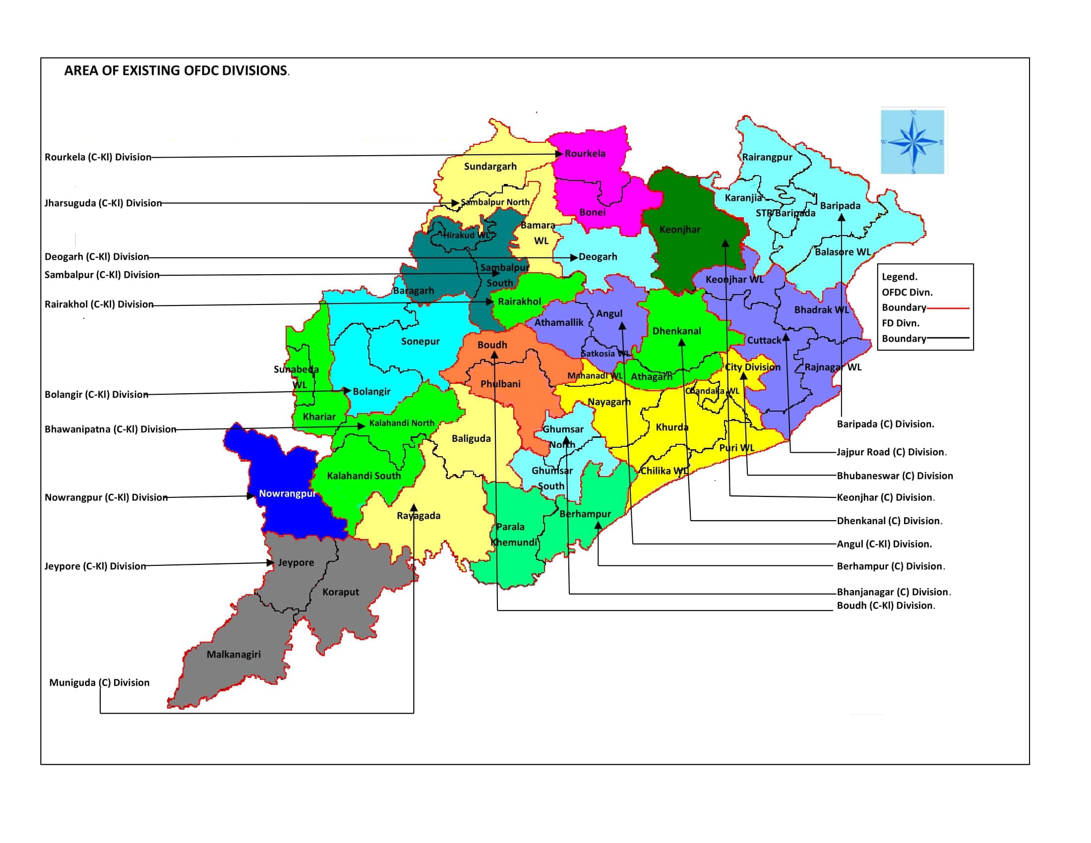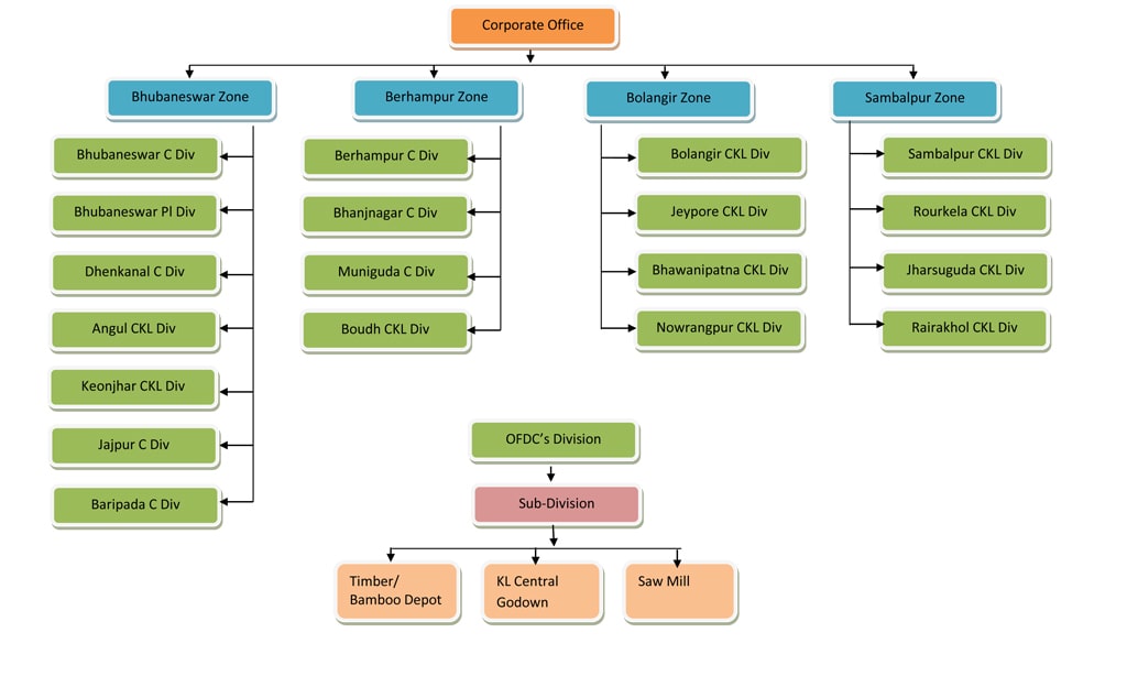 The operational area of the OFDC spread over 30 Revenue Districts in the state of Odisha, is divided into 4 Zones, viz. Bhubaneswar, Berhampur, Sambalpur and Bolangir headed by General Managers which are further sub divided into Working Divisions and Sub-divisions depending upon the current and future work load.