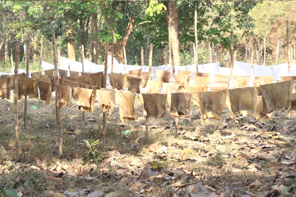 Initially after removing water from freshly set rubber, rubber sheets are dried under the open sunlight for nearly 2 days.