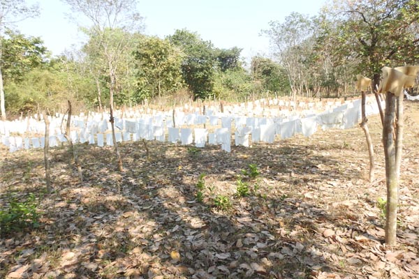 The tapping of rubber plants starts when the plant achieved a growth of 45 cm. Before the tapping starts the desired trees are marked and the tapping device are fixed on the stem of the tree at the height of 1.35 m.